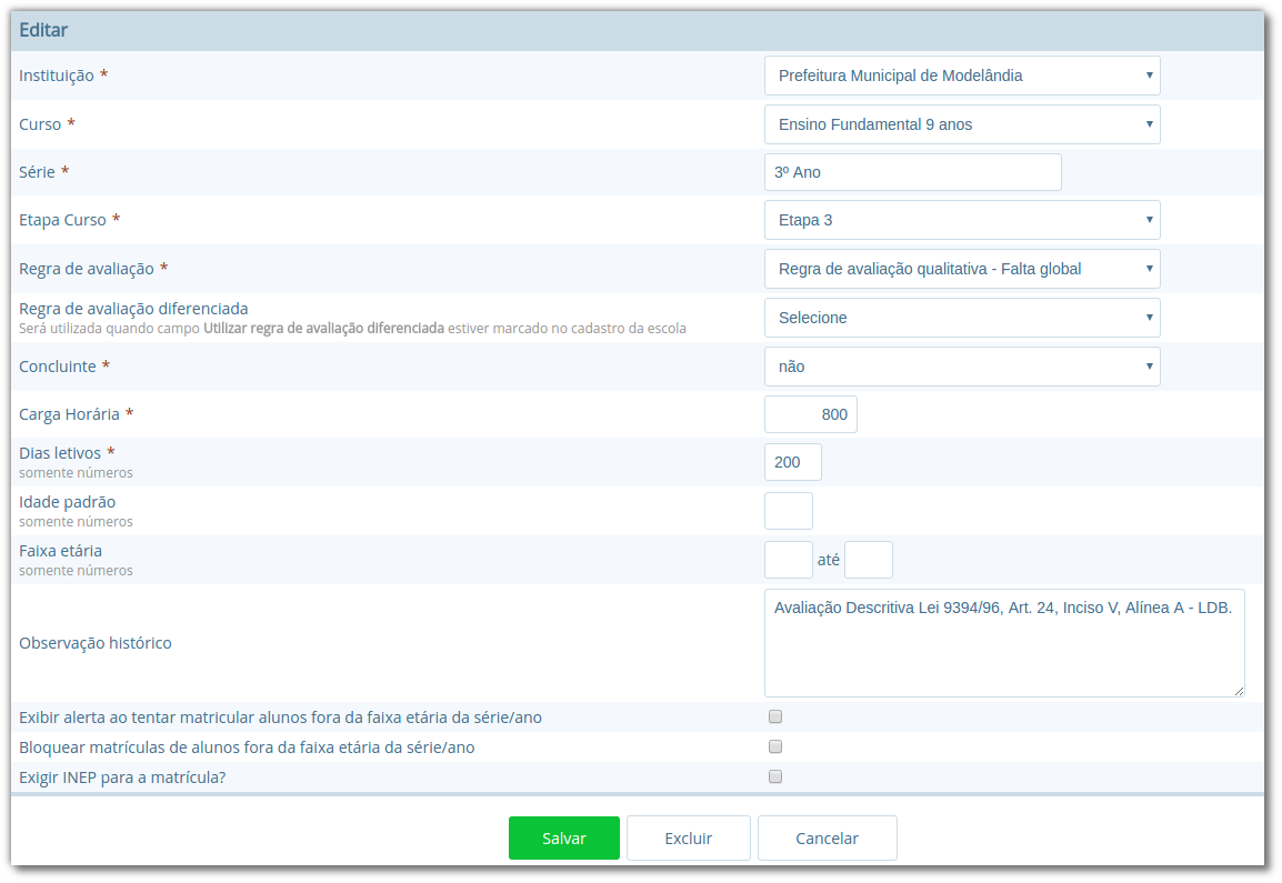 As principais opções encontradas no cadastro de Séries da escola estão detalhadas a seguir: