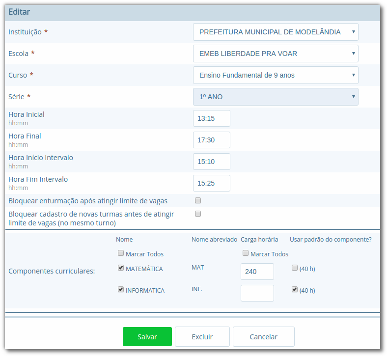| Carga horária | Nesta opção deve ser informada a carga horária total da série/ano, informação que posteriormente é utilizada para verificar a frequência do aluno. |